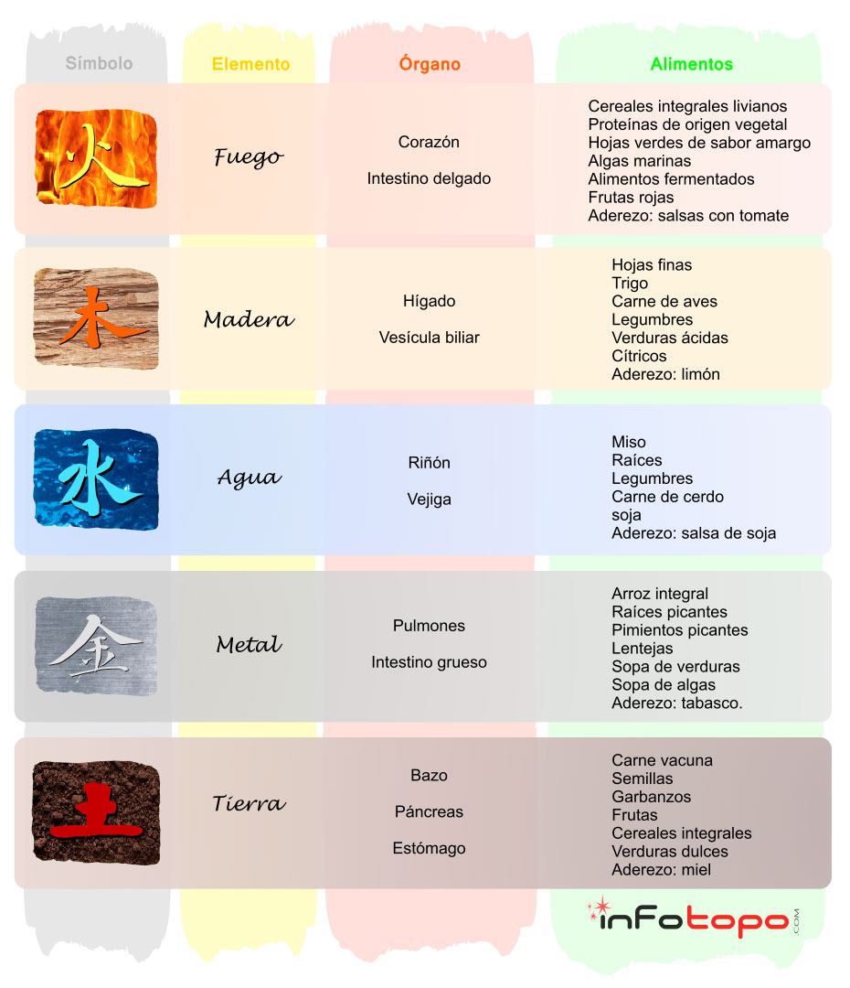 tabla con los alimentos a ingerir segun el elemento chino y los alimentos especificos